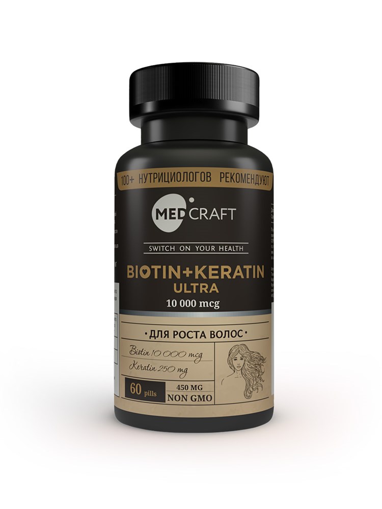- Высокая дозировка: 10 000 мкг биотина – оптимальное количество для стимуляции роста волос.