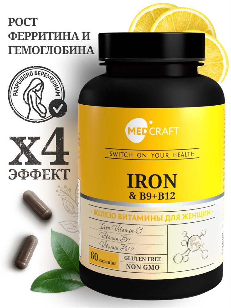 Представляем вашему вниманию IRON MedCraft - железо витамины для женщин. Оцените удобную форму комплекса (хелат бисглицината): хелатное железо всасывается в неизменном виде, оно обладает биодоступностью в 4 раза выше обычных препаратов (сульфат и фумарат железа). Также у этой формы нет побочных эффектов (она не раздражает желудок, не вызывает запор). Наш комплекс это эффективная профилактика и лечение анемии. Он создан против усталости, головокружения и общего снижения бодрости — частых признаков хронической нехватки железа (феррум) и витаминов группы B.
