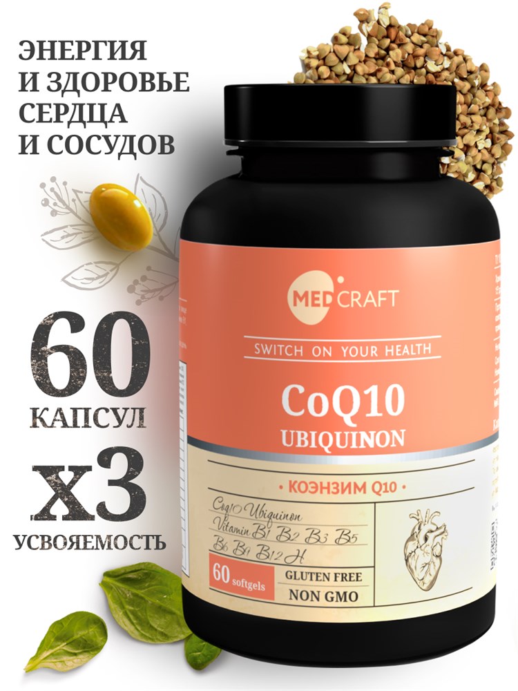 Комплекс Коэнзим Q10 (Убихинон) MedCraft. Комплекс выпускается в капсулах в жидкой форме (softgels) и содержит в 2х капсулах рекомендуемую суточную дозу коэнзима. Кроме coq10 в капсуле также содержится биотин (витамин H), кверцетин и витамины группы в комплекс сбалансирован и подходит для ежедневного применения.