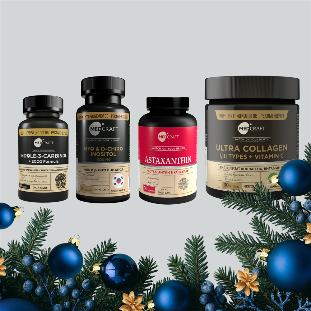 Внутри – Индол-3-карбинол с EGCG, Мио и D-хиро инозитол, Астаксантин и Ultra Collagen (гидролизат коллагена I, II, III типов с витамином С). Формула набора помогает заботиться о женском здоровье и внешнем виде изнутри: поддерживает обмен эстрогенов, состояние кожи и соединительной ткани, защиту от окислительного стресса. MedCraft